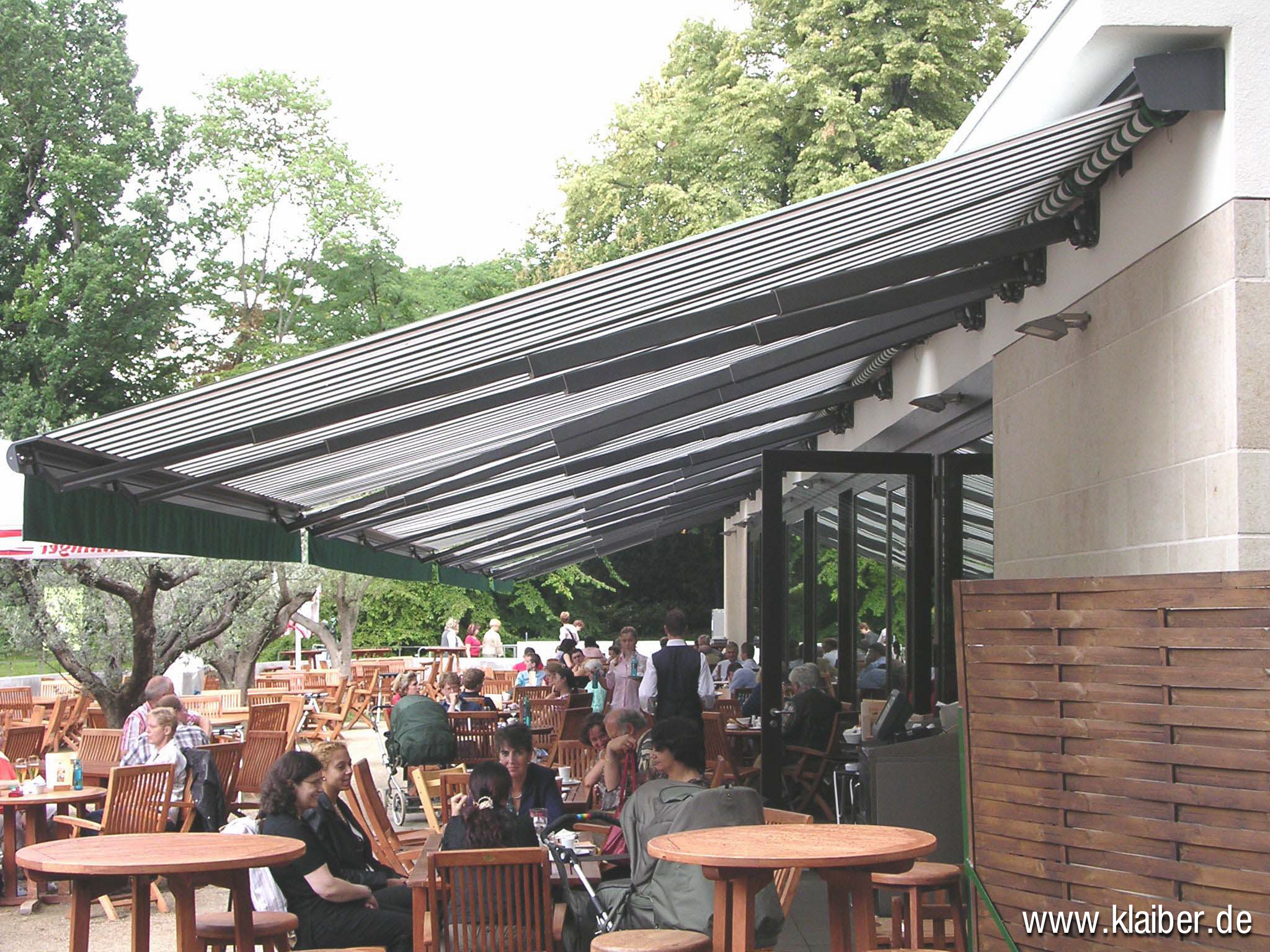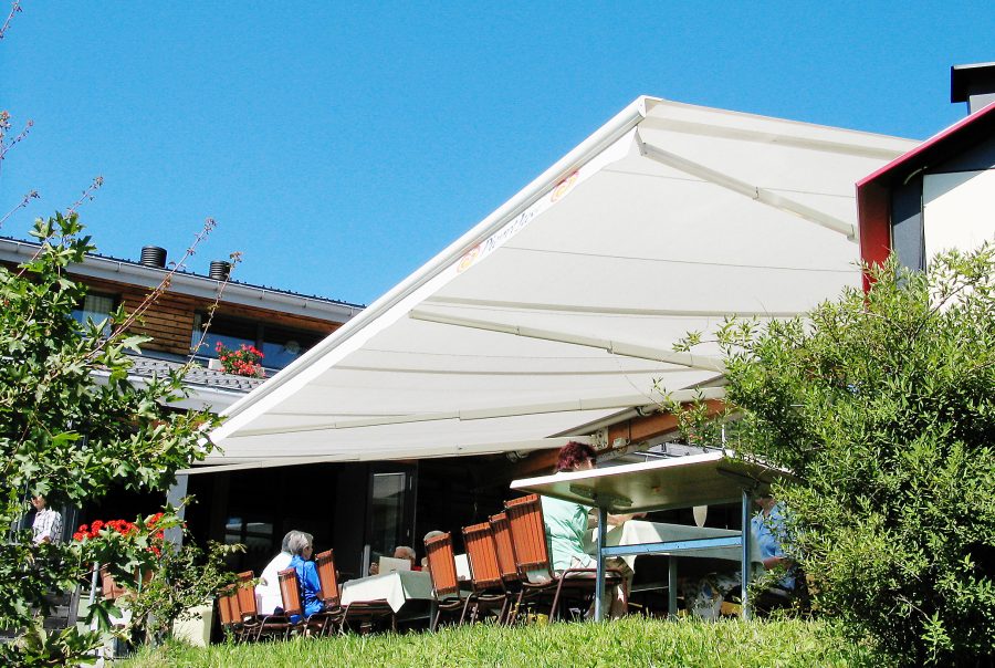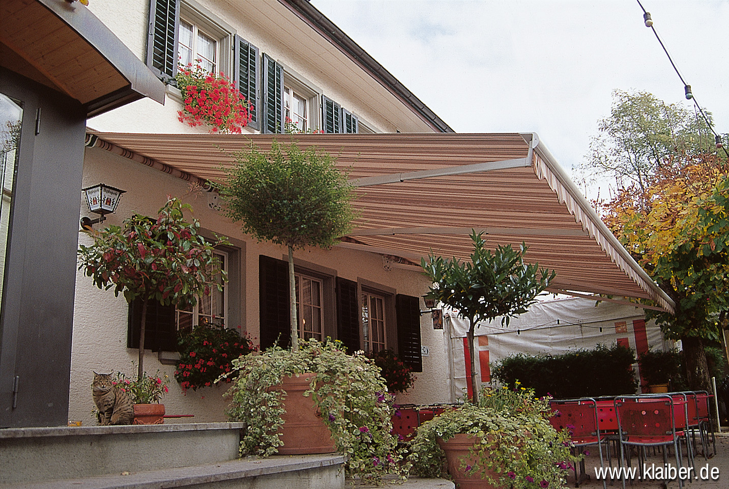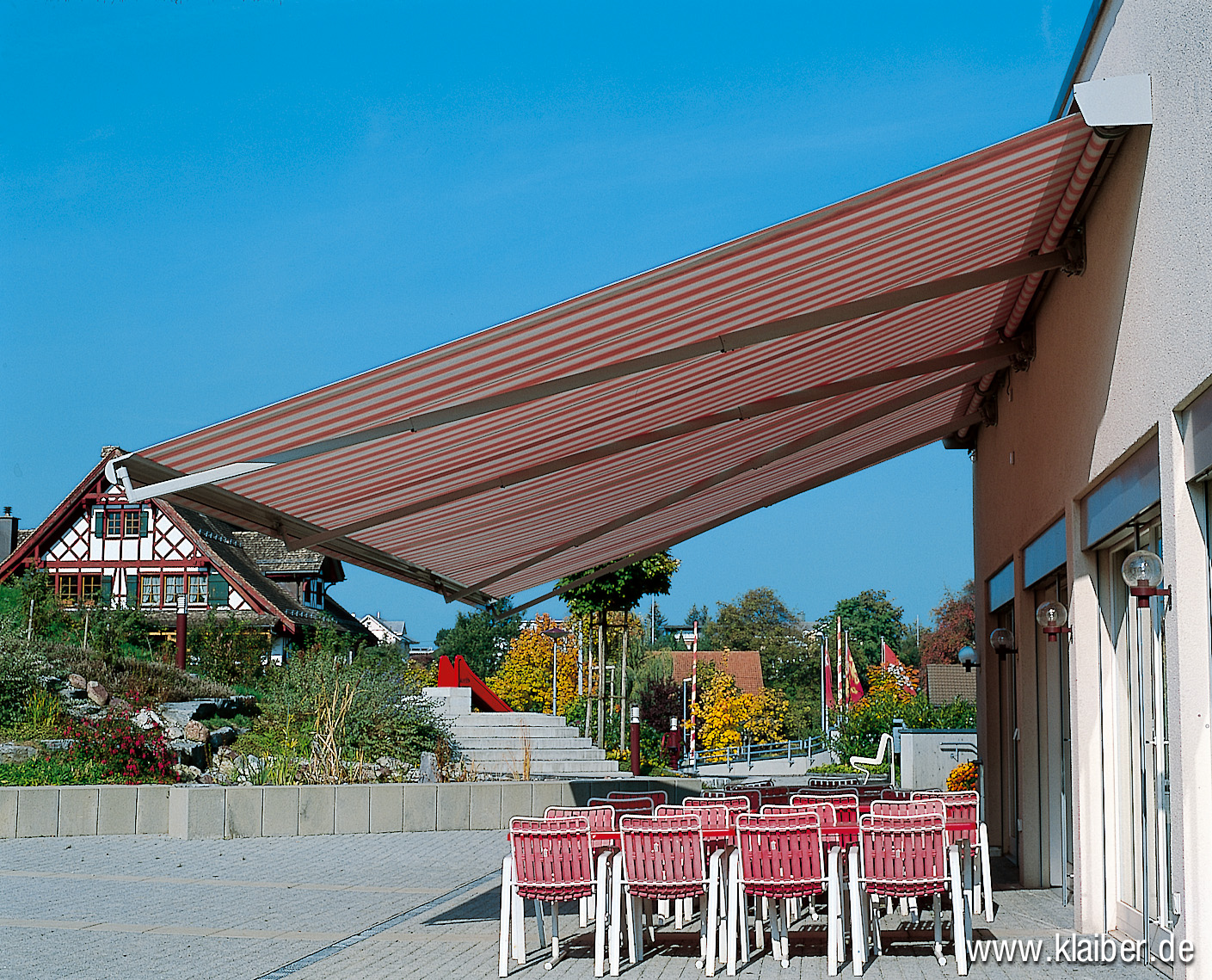Die Jumbo-Großflächenmarkise der Marke KLAIBER bis 5 m Ausfall überzeugt durch ihre extrem stabile Konstruktion und ist besonders für den Gastronomiebereich geeignet. Die Arme sind über eine Montage-Wandplatte direkt mit dem Mauerwerk verbunden. Bei den Montagemöglichkeiten ist eine Anbringung an Wand oder Decke wählbar.